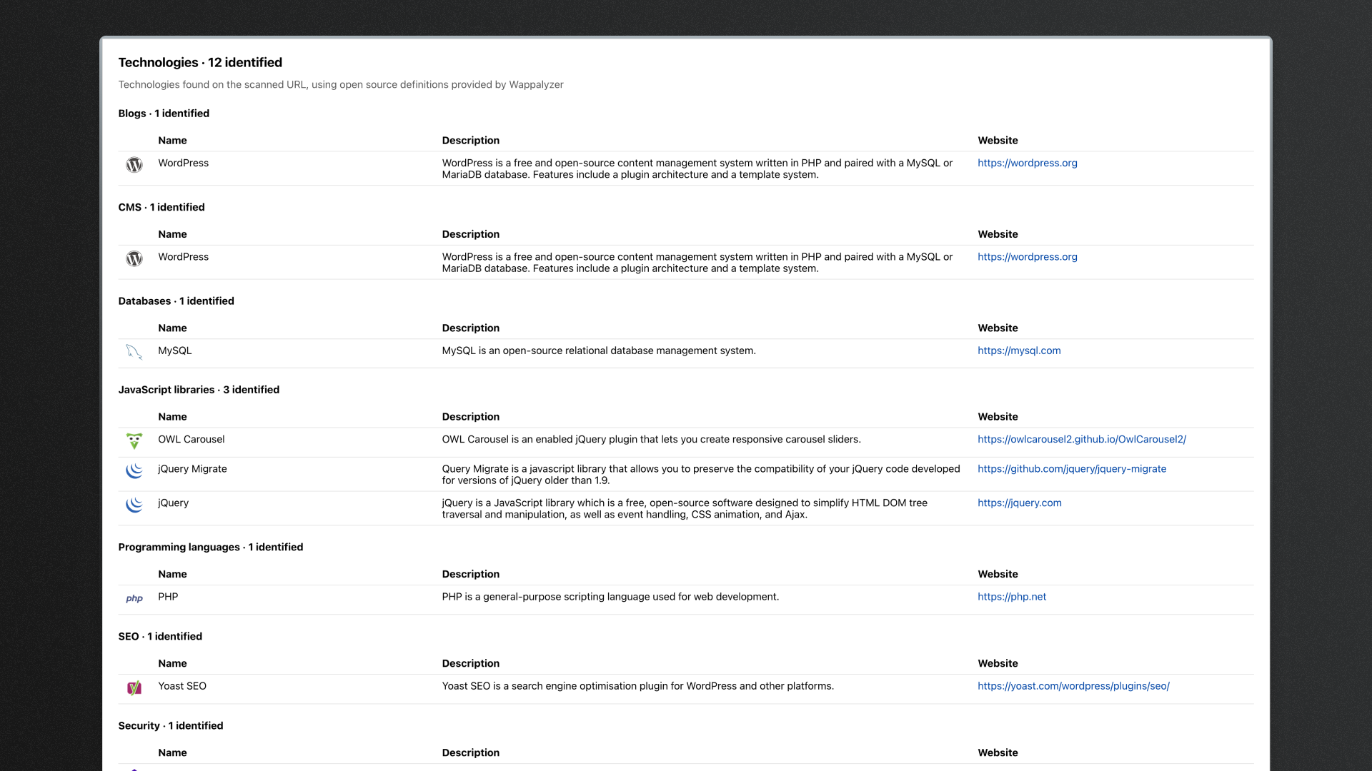 It was determined that the URL Scanner should return information about the submitted URL relating to the anatomy of a webpage. These categories could be summarised as: