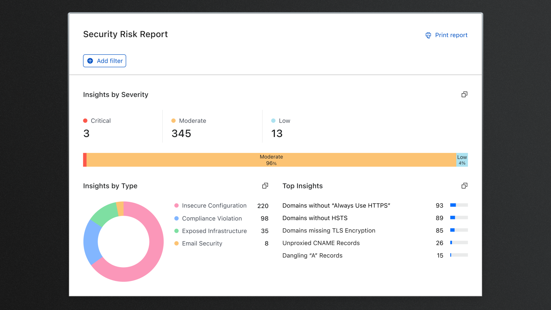 Some users were not familiar navigating through the Cloudflare Dashboard and they wanted a straightforward way of mitigating the risk. Making what's complex, simple, has always been a goal of when whatever feature I'm designing. Where possible, we included a single click, resolution workflow. Here, users would be able to read a summary of the risk and either take action on it, or archive the issue. Alternatively, if we wouldn't manage the issue from this page, we would help the user navigate to the correct page within the dashboard.